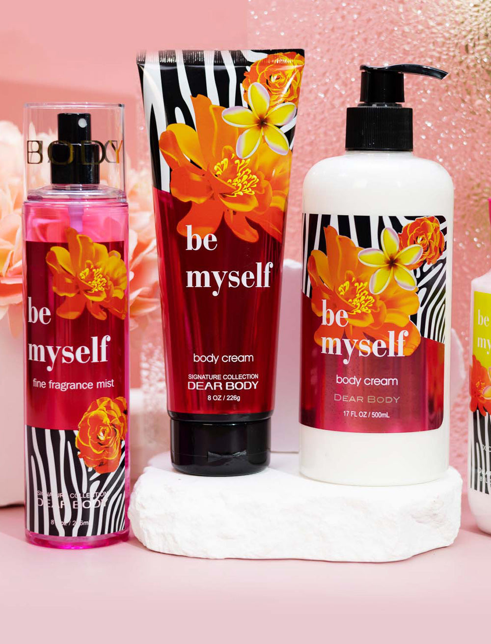 Indulge your skin with the luxurious “Be Myself” Body Butter. Rich and creamy, this body butter is designed to deeply moisturize and nourish your skin. The sweet and tangy head notes of Black Currant, Strawberry, and Cassis uplift your senses, while the floral heart of Ginger Lily, Peony, and Jasmine soothes and calms. The base notes of Amber Wood, Patchouli, and Vanilla Musk wrap you in a warm and comforting embrace, leaving your skin feeling soft, supple, and delicately scented all day long.