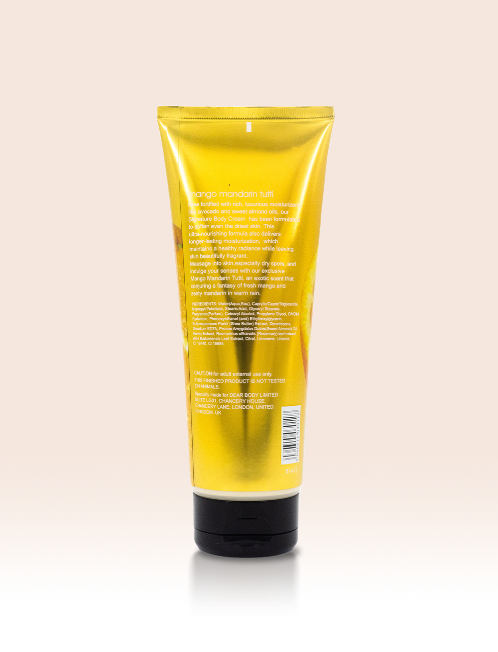 Elevate your senses with Mango Mandarin Tutti Body Cream. Envelop yourself in this exhilarating fragrance and let it transport you to a realm of vitality and tropical paradise as you pamper your skin, leaving it nourished, beautifully scented, and irresistibly soft. Embrace the vibrant aromas of mangoes and mandarins and make every skincare moment a tropical escape.